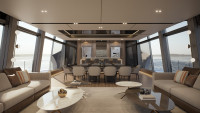 One of the brand-new features on this yacht is the beach area. The aft door opens like the roof of a convertible sports car, revealing a magnificent 36 square metre lounge area on the sea. The side garage can fit a tender and 2 jet skis. One the sundeck is a large convivial space furnished with comfortable sofas and a bar located amidships, while the huge 60 quare metre forward areas offers the Owner and his guests a sunbathing area and an infinity pool.