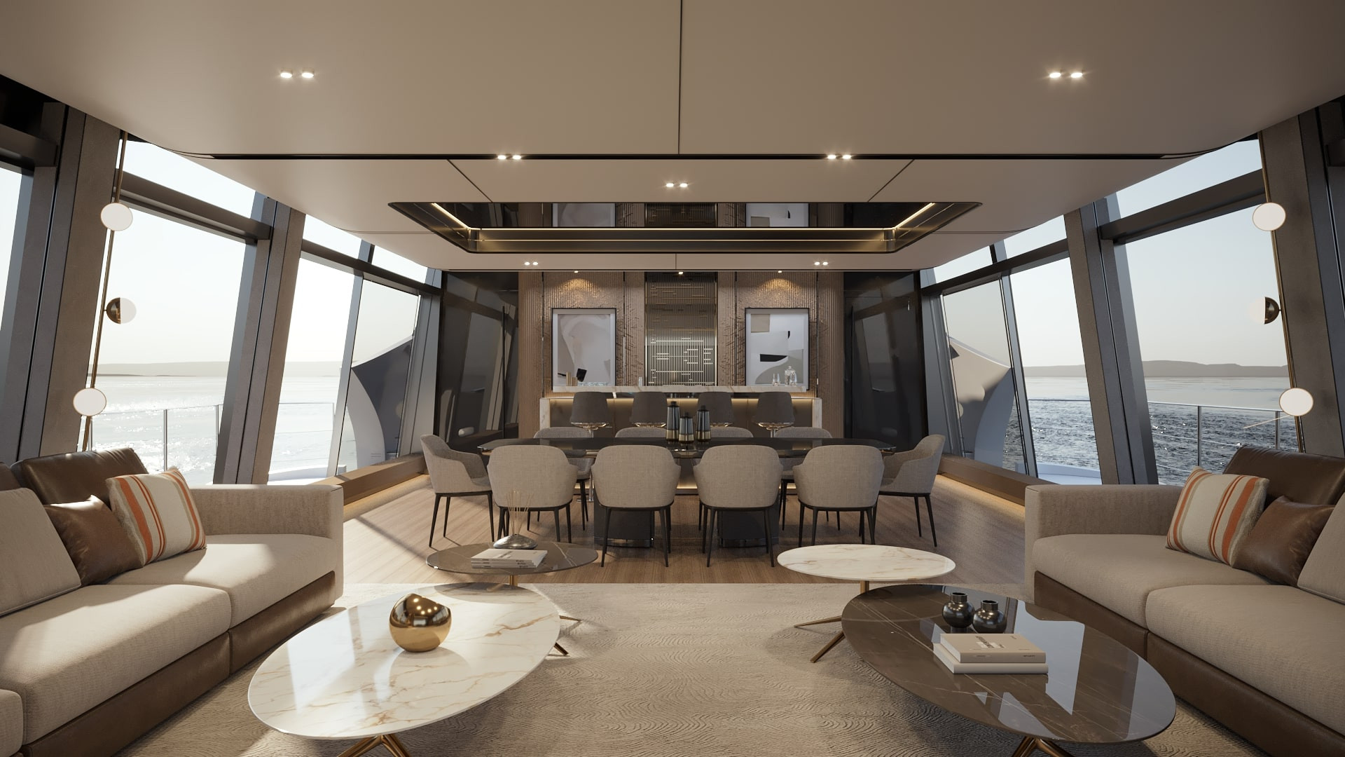 The interiors have been styled by Milan-based architecture firm M2 atelier using warm colour shades and implementing contemporary solutions aimed at making the most of natural light, which is the key element on this vessel. Floor-to-ceiling windows in the salon create a natural flow between interior and exterior, with a cosy and sophisticated atmosphere. The main salon is complete with a sofa lounge set and a large dining area, which also includes a bright bar counter illuminated by three skylights that let through plenty of natural light.
