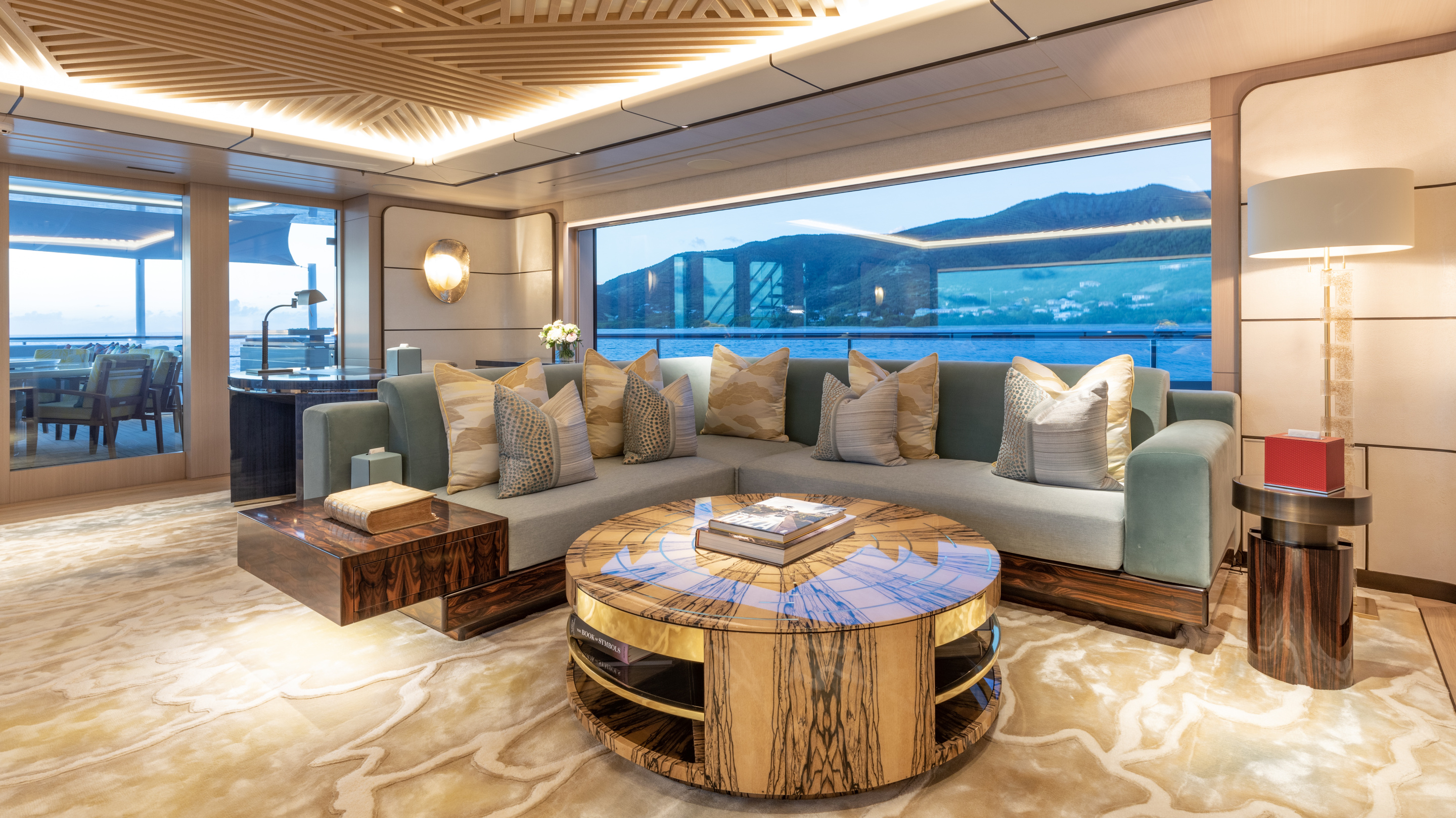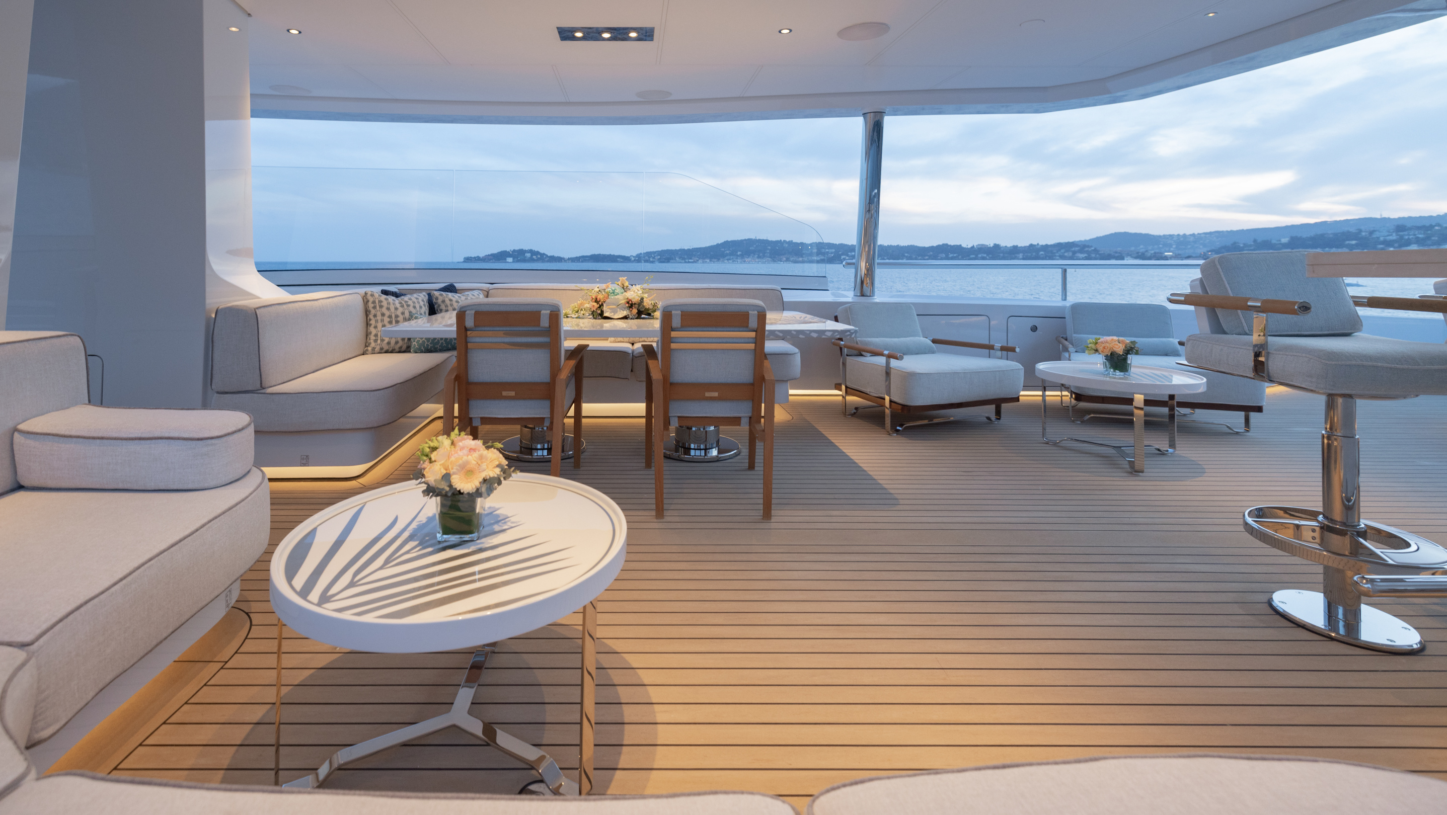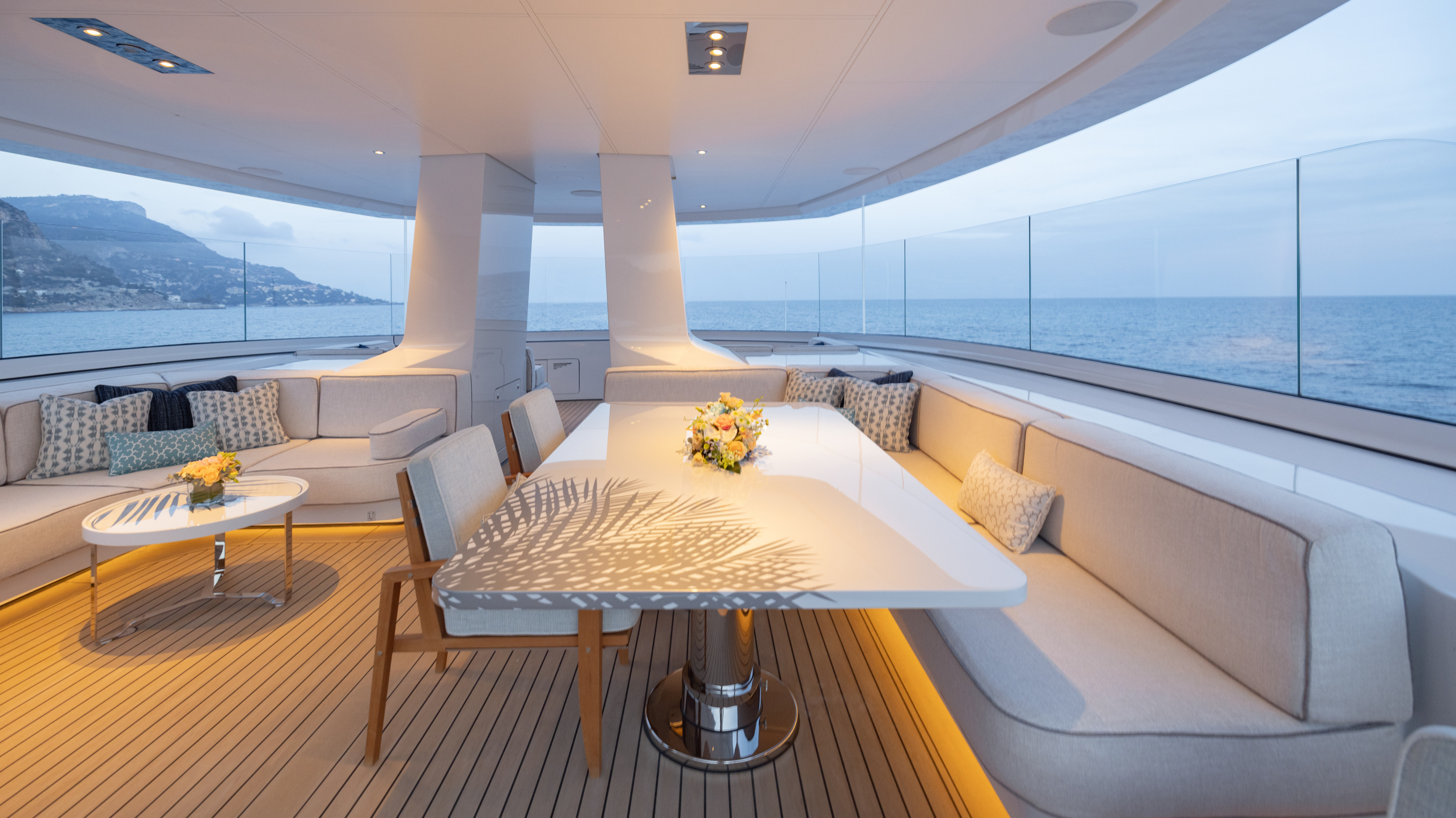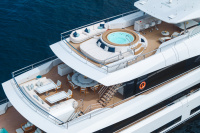 MOON SAND offers a wealth of spaces for every mood. The main deck aft is home to a remarkable swimming pool with a rise-and-fall floor and a counter-current system, perfect for both leisure and exercise. The sun deck, upgraded in 2024 by AZURE Yacht Design, now boasts enhanced wind protection, a new jacuzzi, additional sun pads, and expanded dining options. The bridge deck features a circular dining table with a Lazy Susan for up to 12 guests, a sky lounge configured for games and relaxation, and a fully equipped gym.
