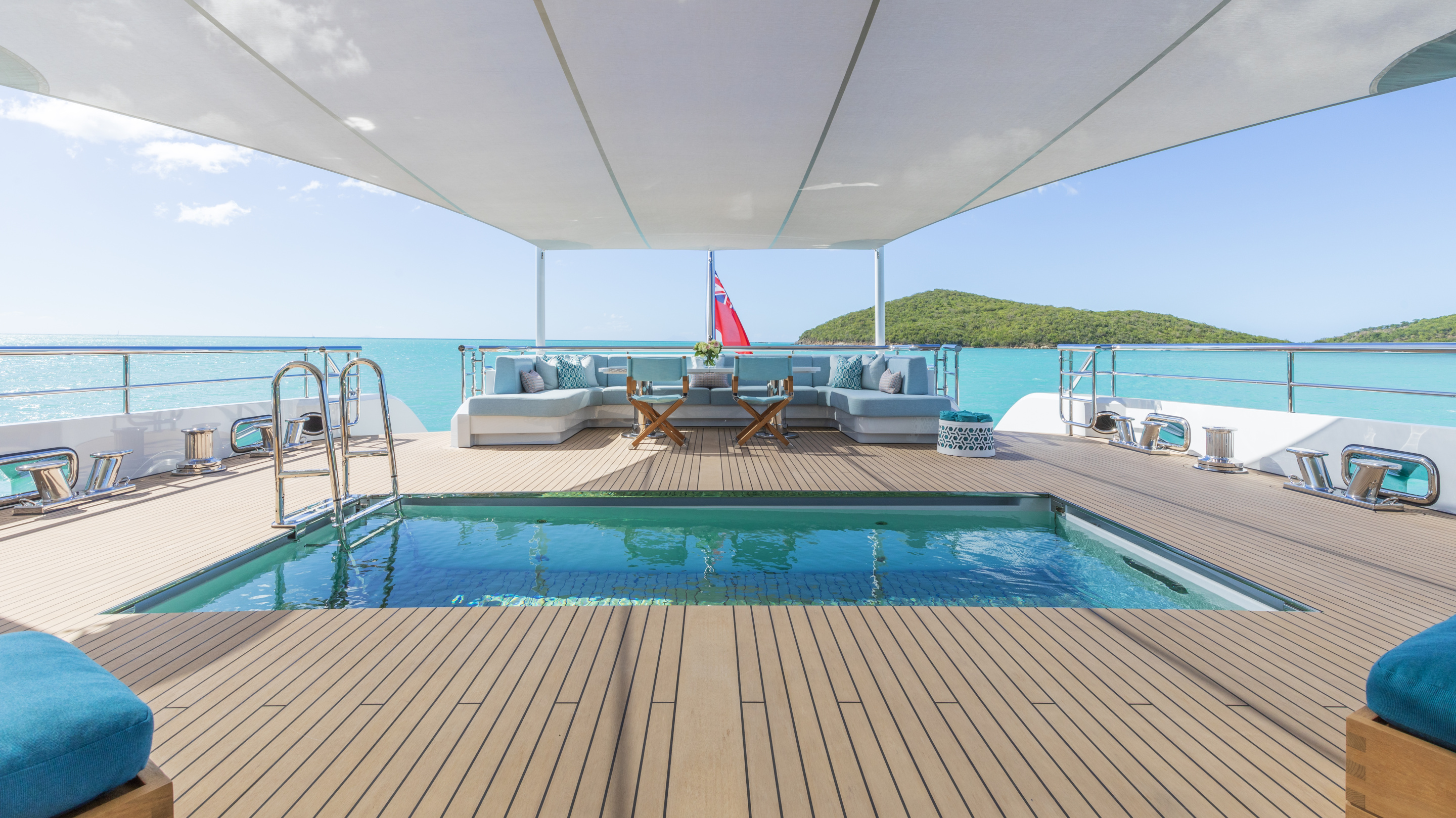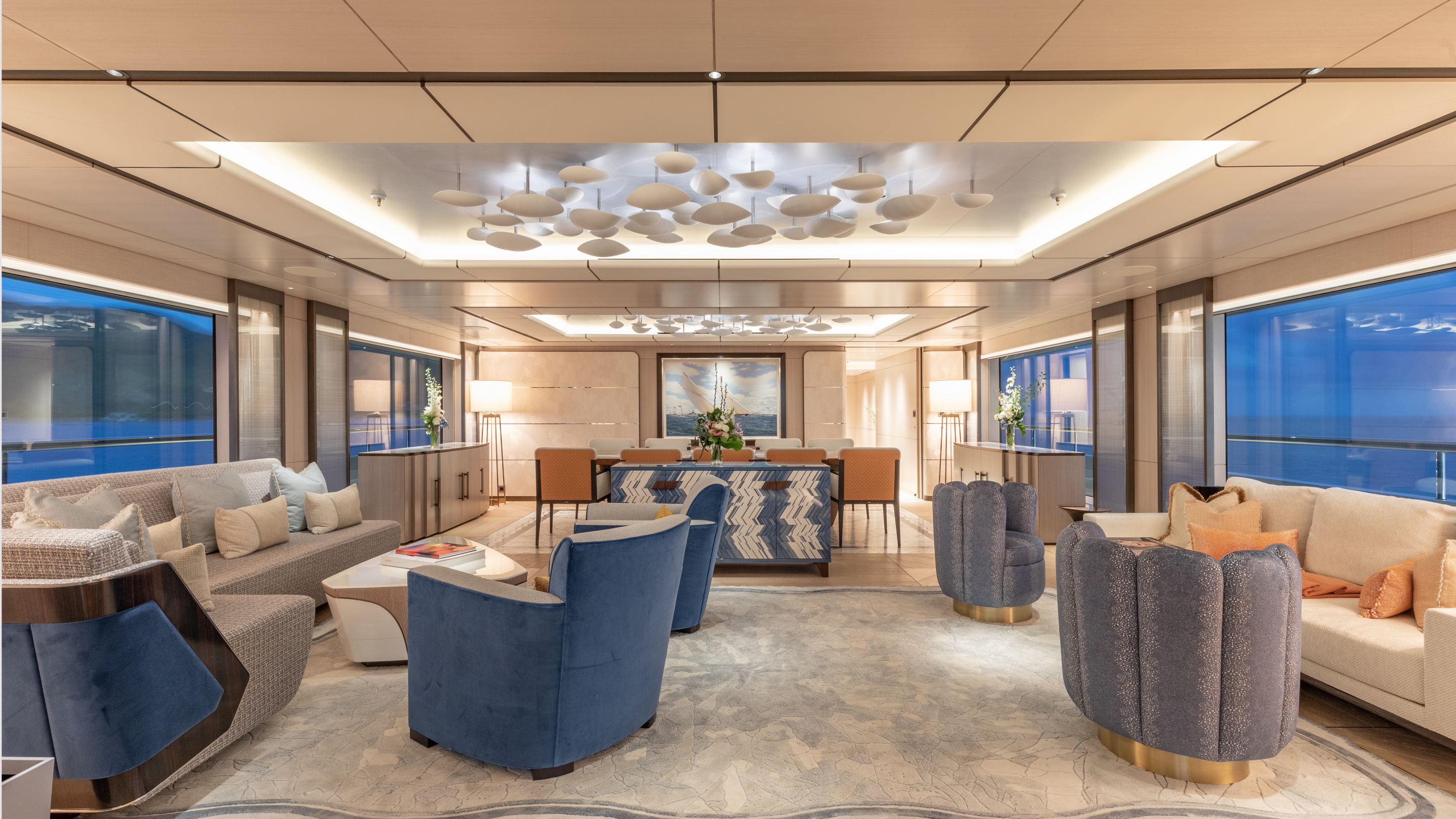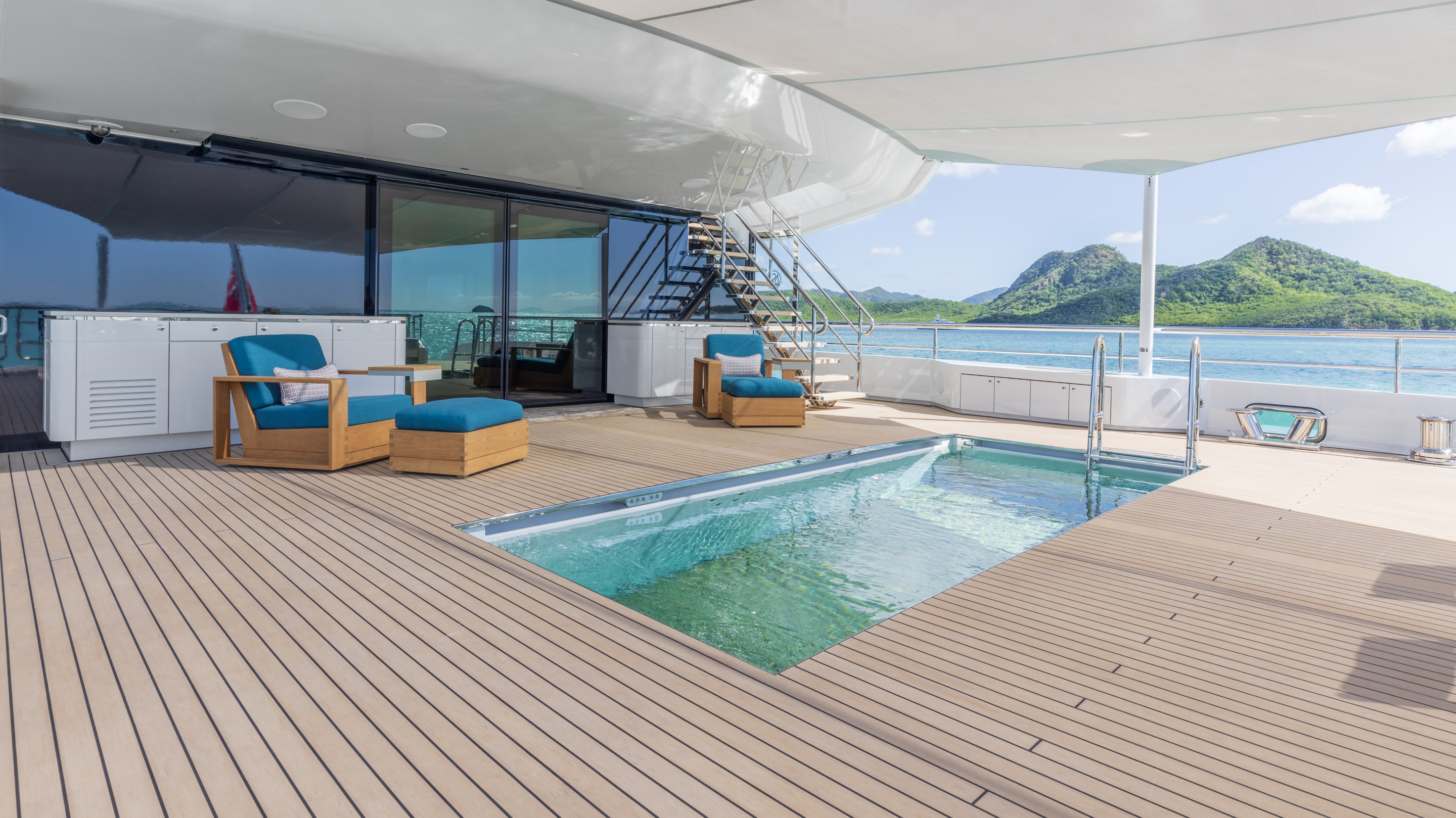 MOON SAND offers a wealth of spaces for every mood. The main deck aft is home to a remarkable swimming pool with a rise-and-fall floor and a counter-current system, perfect for both leisure and exercise. The sun deck, upgraded in 2024 by AZURE Yacht Design, now boasts enhanced wind protection, a new jacuzzi, additional sun pads, and expanded dining options. The bridge deck features a circular dining table with a Lazy Susan for up to 12 guests, a sky lounge configured for games and relaxation, and a fully equipped gym.