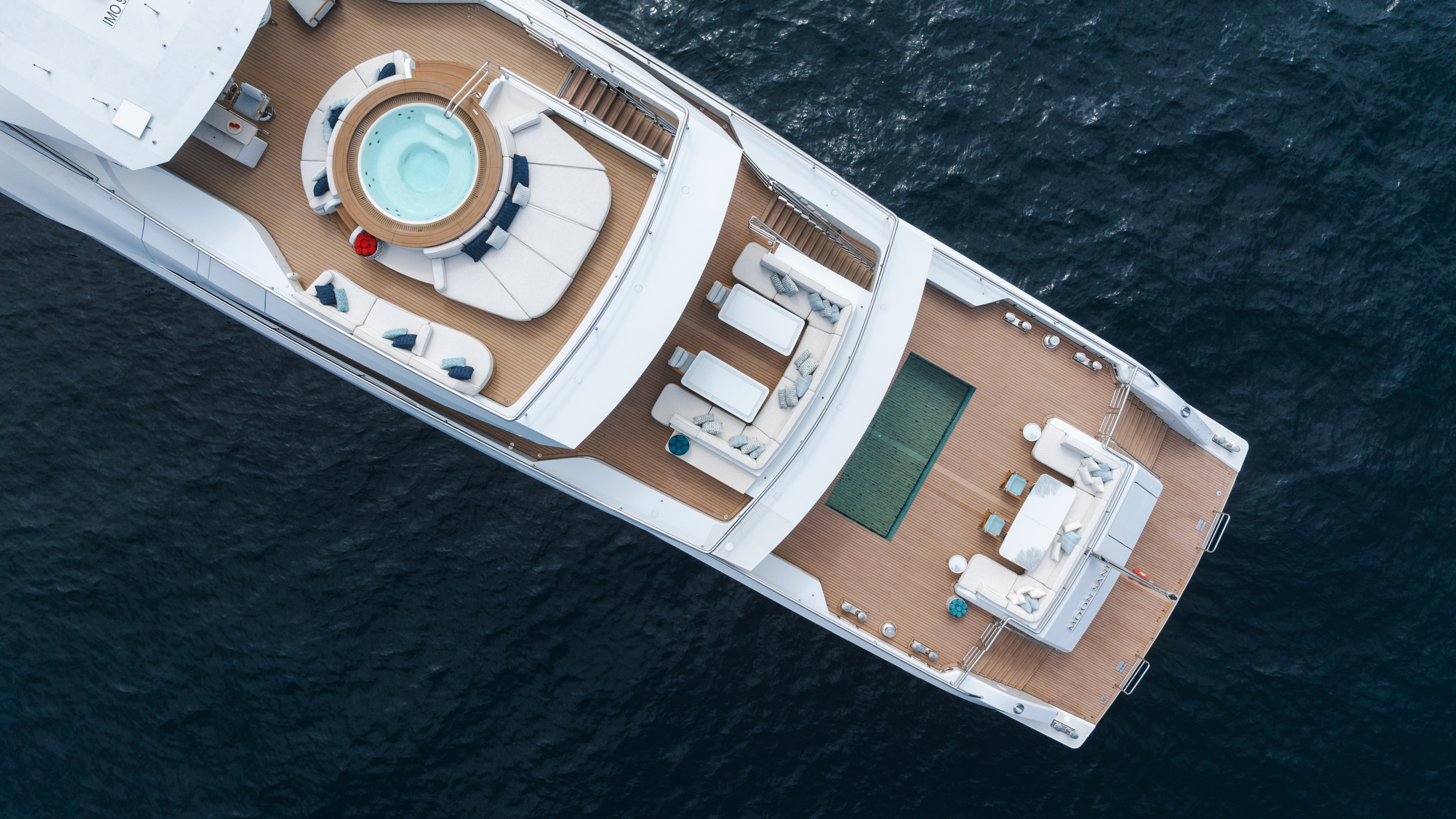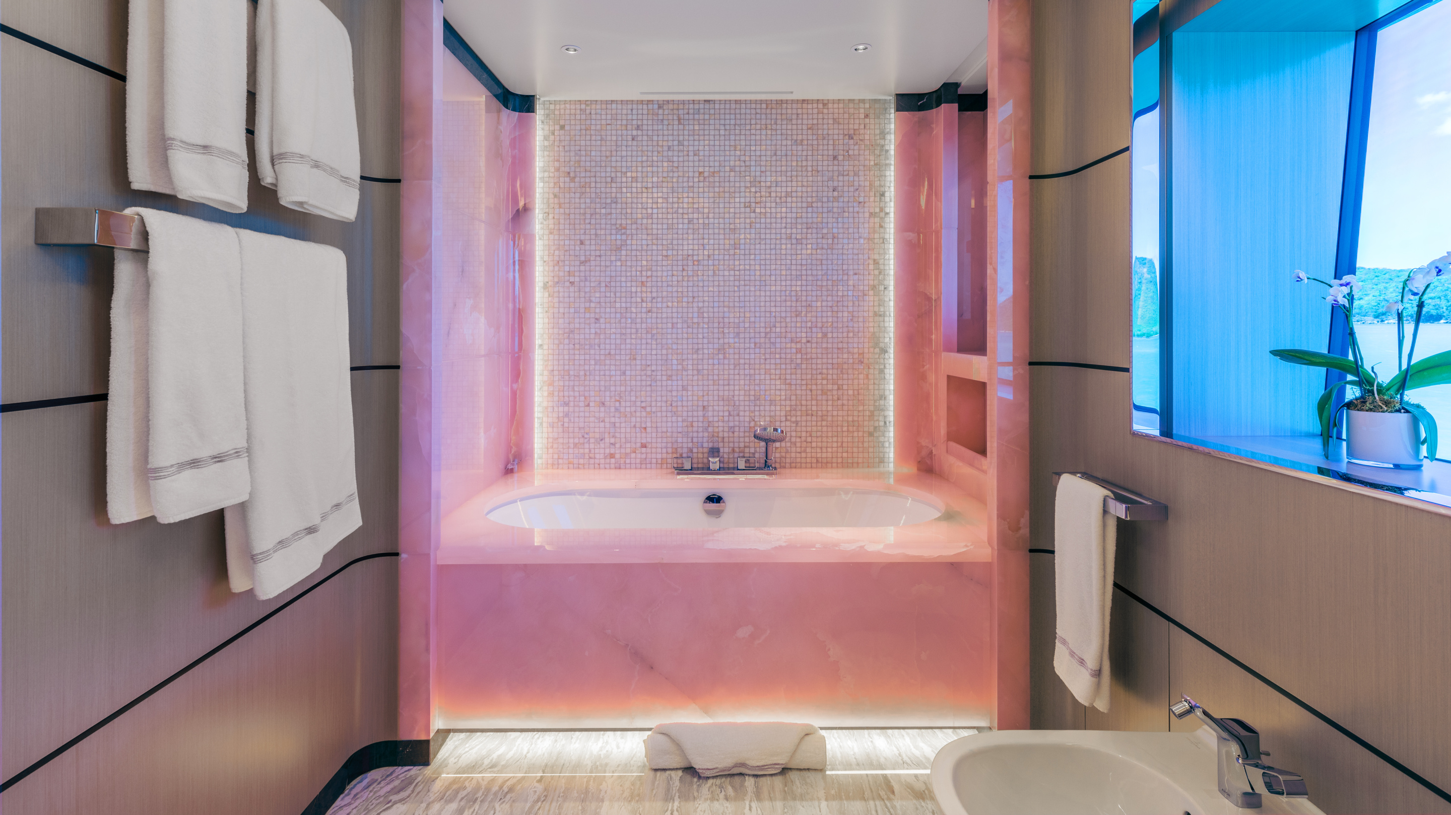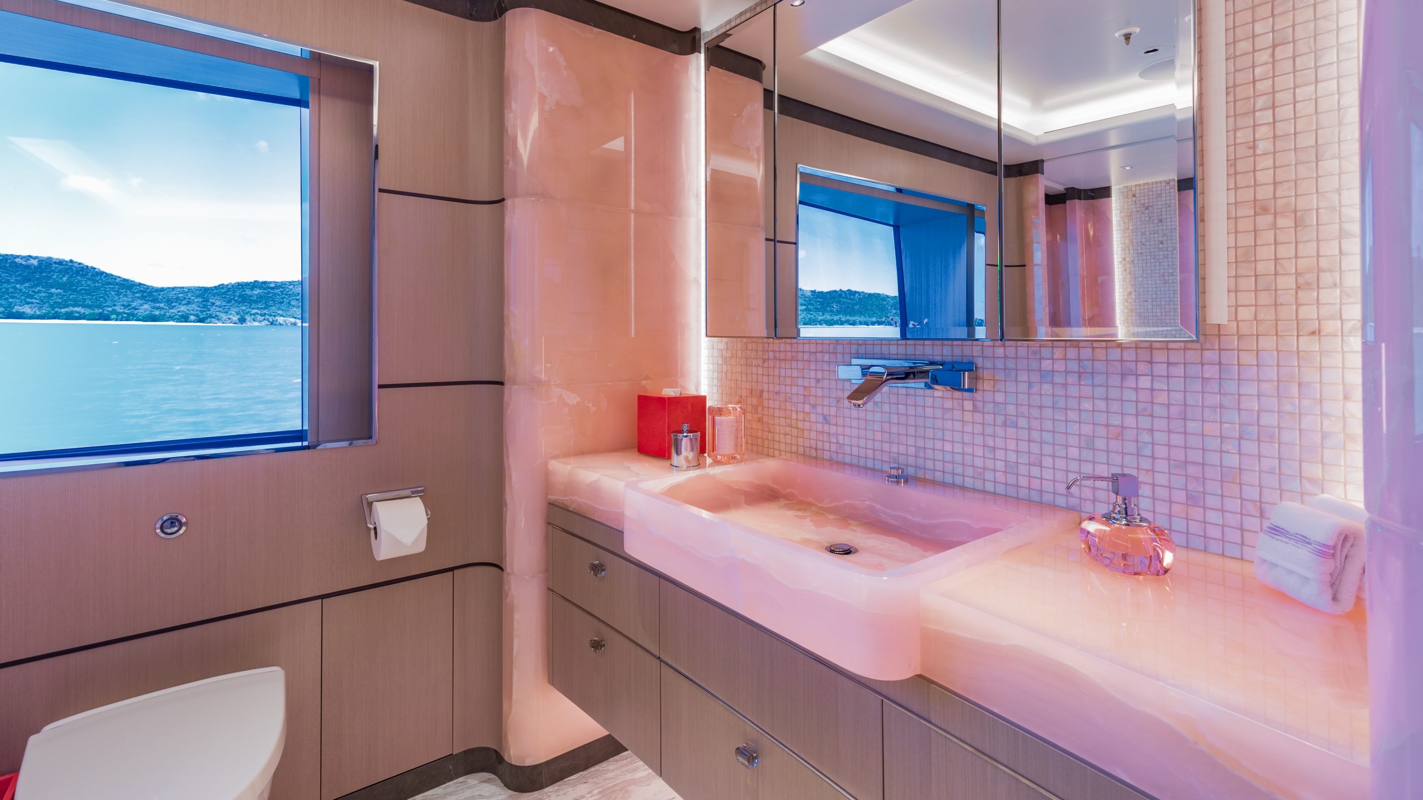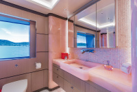 The owner’s suite, situated forward on the main deck, is a private retreat complete with its own entrance lobby, a generous walk-in wardrobe, and separate ‘his and hers’ en suites. A standout feature, and a talking point among those who step aboard, is the magnificent marble bathroom in the owner’s suite. The bathtub and rare pink marble were personally selected by the owner’s wife during a trip to Italy, resulting in a space that is both luxurious and deeply personal. The pink marble bathroom is not only a testament to bespoke design but also a symbol of the collaborative spirit that defined MOON SAND’s creation.